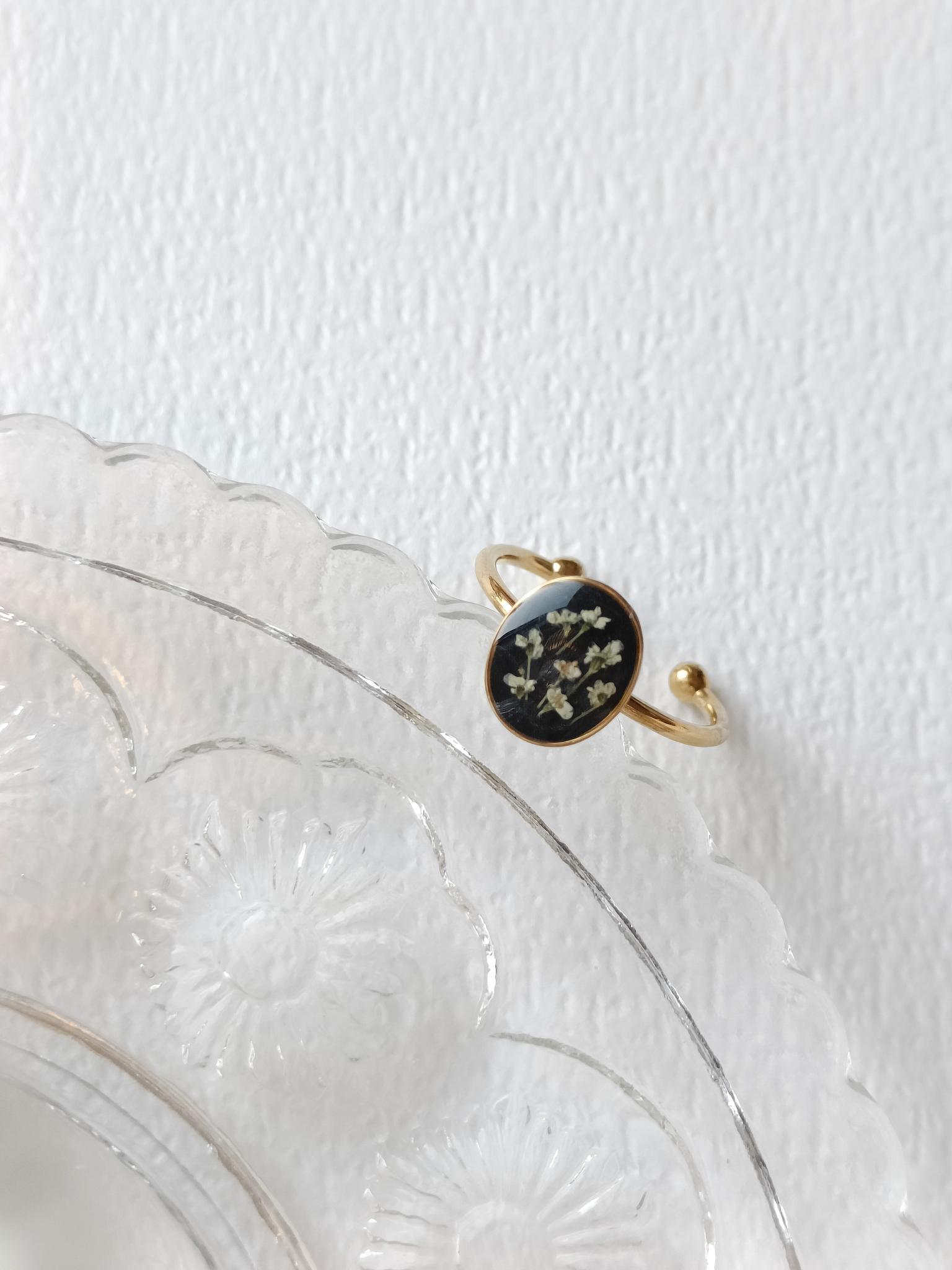Käsintehty sormus prässätyistä kukista. Kukat ja terälehdet asetellaan koruihin yksitellen, joten tuotteen ulkonäkö saattaa poiketa hieman kuvista.