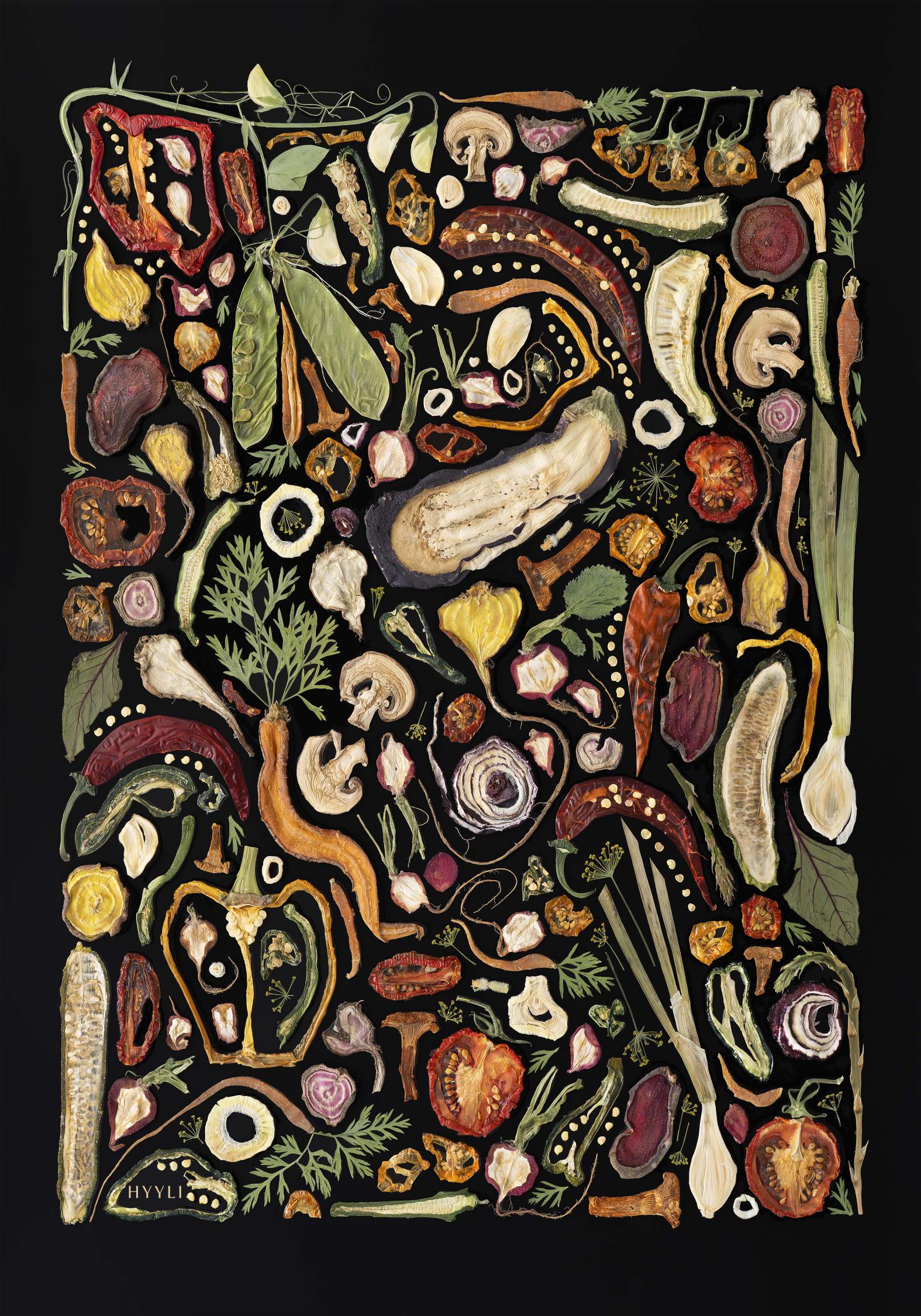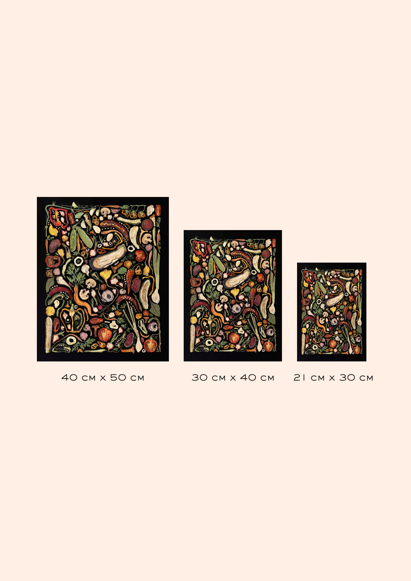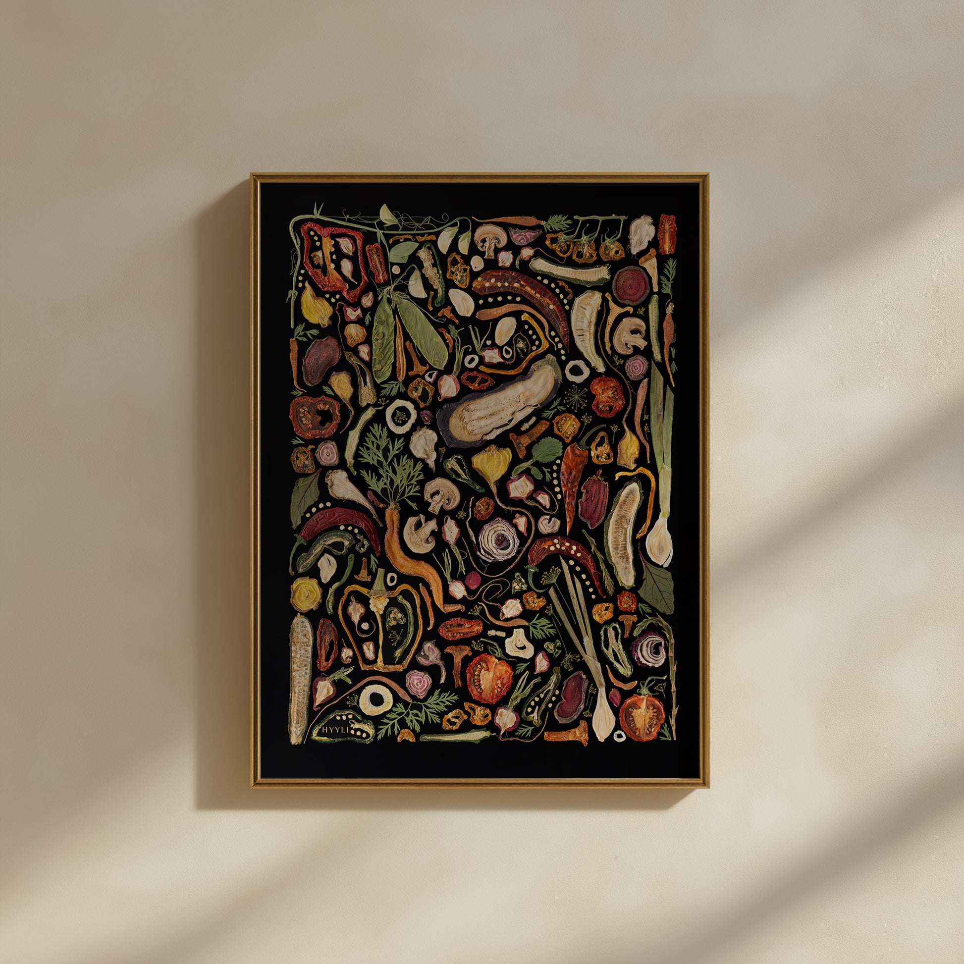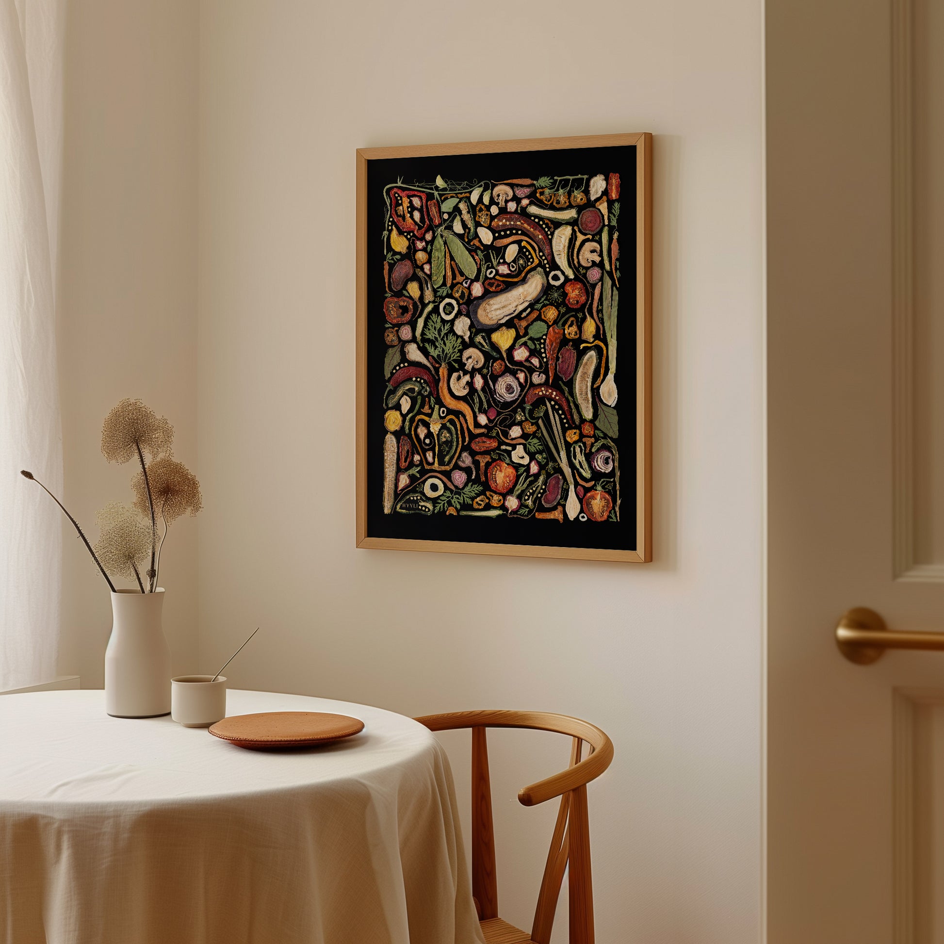 Sisustusjuliste on teetetty prässätystä kasvistaulusta. Taulun kasvikset on prässätty ja koottu uniikiksi taiteeksi. Juliste on painettu laadukkaalle mattapaperille, joka korostaa kasvisten luonnollisia sävyjä ja tekstuuria.