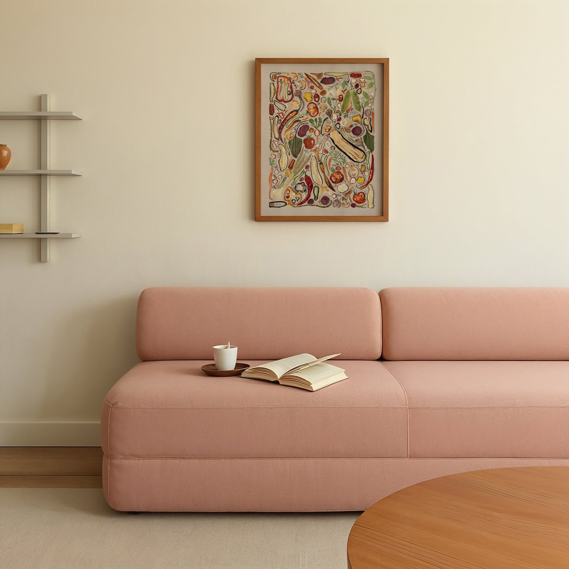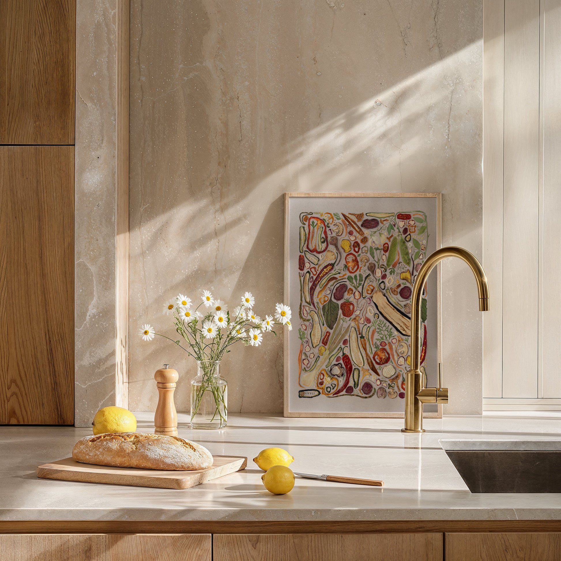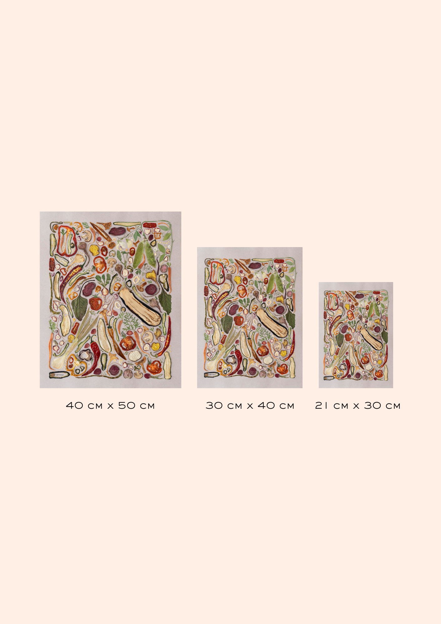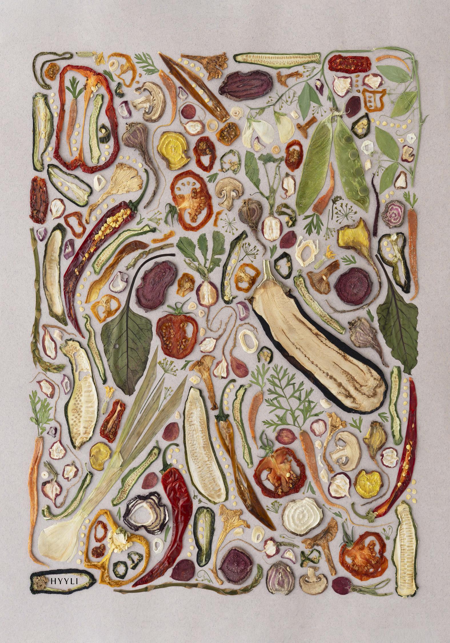 Sisustusjuliste on teetetty prässätystä kasvistaulusta. Taulun kasvikset on prässätty ja koottu uniikiksi taiteeksi. Juliste on painettu laadukkaalle mattapaperille, joka korostaa kasvisten luonnollisia sävyjä ja tekstuuria.